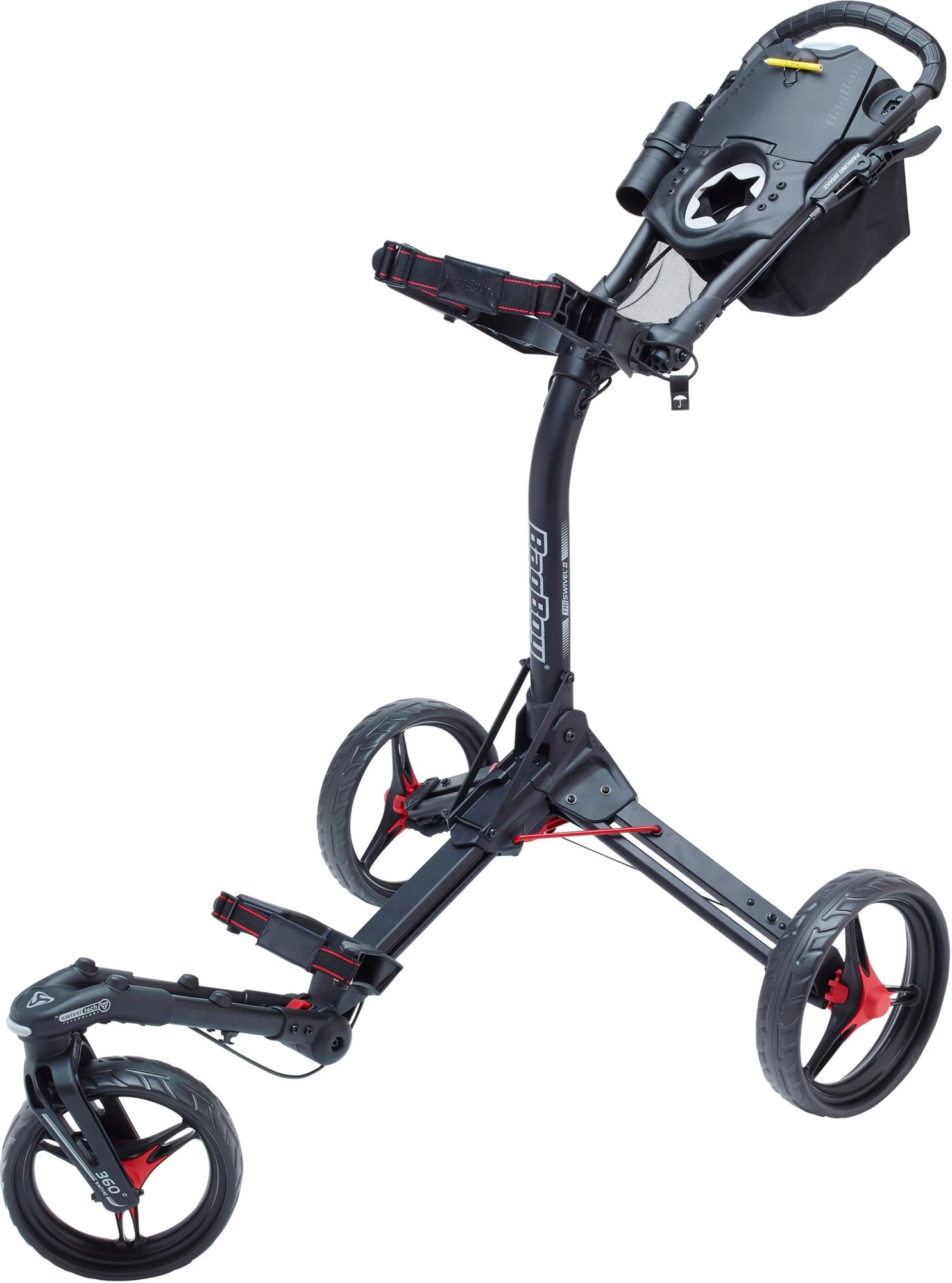 Effortlessly navigate the course with a TriSwivell II Push Cart. This lightweight push cart, constructed of lightweight aluminum, features oversized wheels and a durable handle grip for ease of use. The top panel offers scorecard, golf ball, tee and beverage storage to provide easy gear access. Swivel Tech Technology allows the front wheel to move a full 360° and outfits the Bag Boy® TriSwivel II Push Cart with remarkable range of motion.
