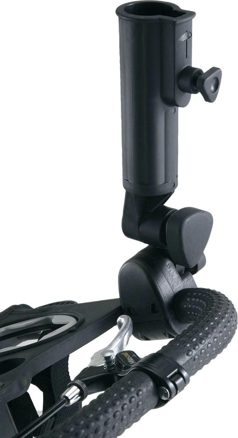 Keep your weather protection at hand by fixing the Umbrella Holder to your push cart. Designed to secure to nearly any round or oval tubing, this holder features a high strength clamp mechanism to ensure the device stays in place. The adjustable internal width accommodates most sizes of umbrella handles for maximum versatility. Left, right, forward and backwards adjustability allows for targeted protection throughout poor conditions.