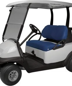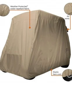 Protect your golf cart while it is not in use with the Fairway FadeSafe Short Quick-Fit Cover. Designed to fit most 2-person golf carts with short roofs, this cover features FadeSafe™ treated fabric for reduced sun bleaching and added durability. Numerous vents and access panels equipped with heavy-duty zippers allow unhindered access and ventilation while the Classic Accessories® Fairway FadeSafe Quick Fit Cover is fixed to your cart.