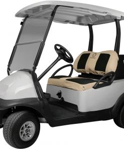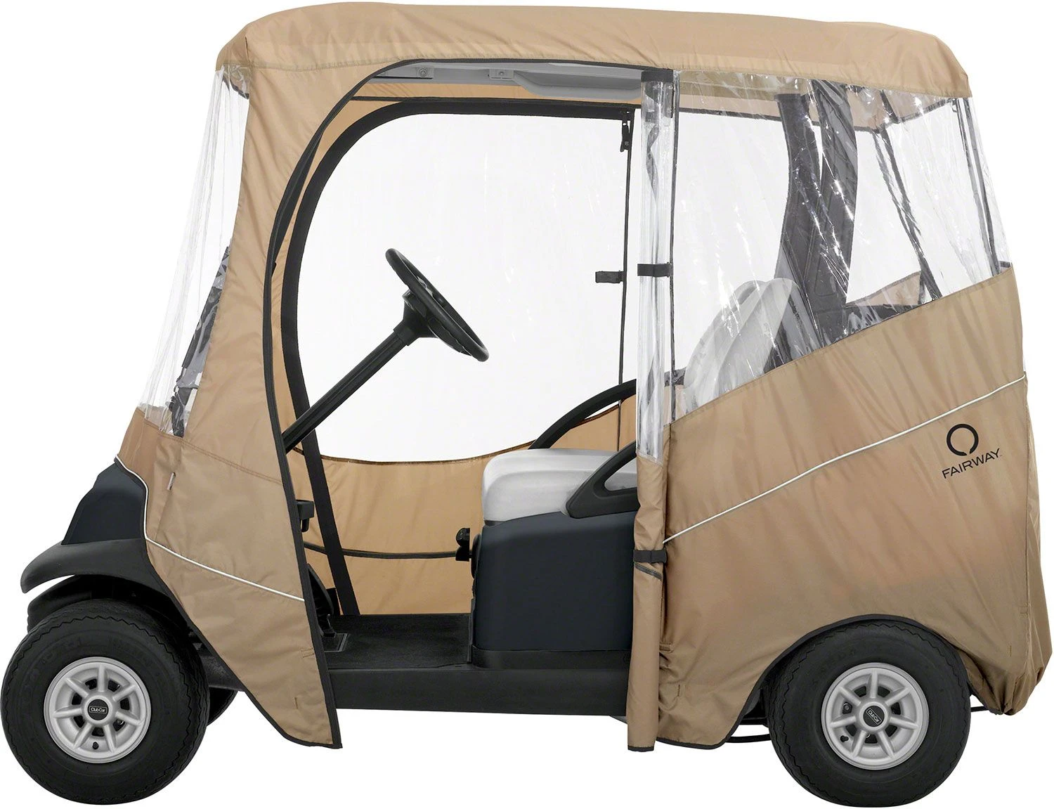 Protect yourself and your equipment from poor weather with a Fairway Travel Short Golf Cart Enclosure. Designed to securely fit most 2-person golf carts with short roofs, this cover is constructed using shrink- and stretch-resistant Weather Protected™ fabric for superior durability. Super-clear window material paired with heavy-duty polyester walls equips the Classic Accessories® Fairway Travel Cart Enclosure with unmistakable quality.