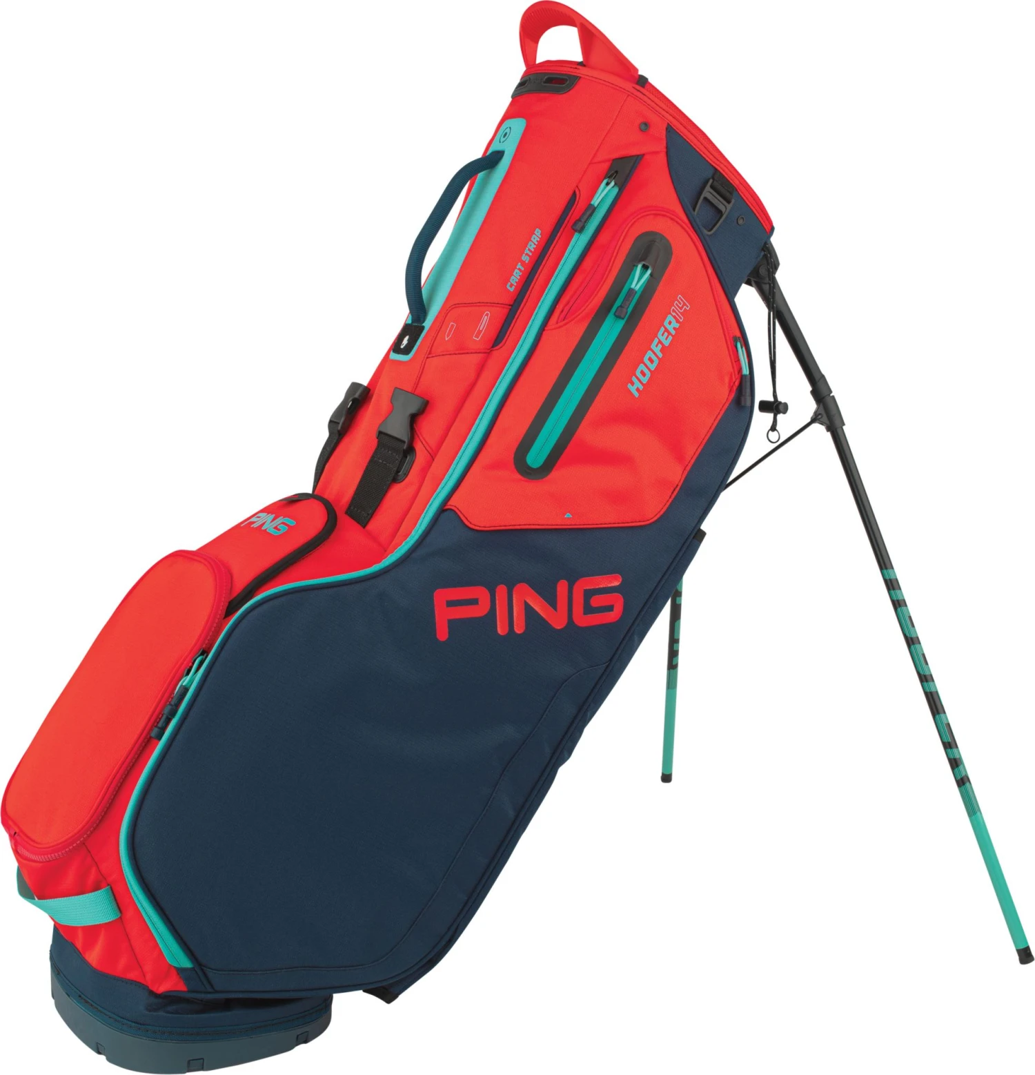 Cruise from tee to green with ease with the PING® 2020 Hoofer 14 Stand Golf Bag. Easy-adjusting shoulder straps allow you to carry either as a dual or single shoulder strap for the ultimate in carrying comfort and fit. The wide leg span is designed for supreme sturdiness, while the strap channel secures to the cart without sacrificing accessibility to pockets.