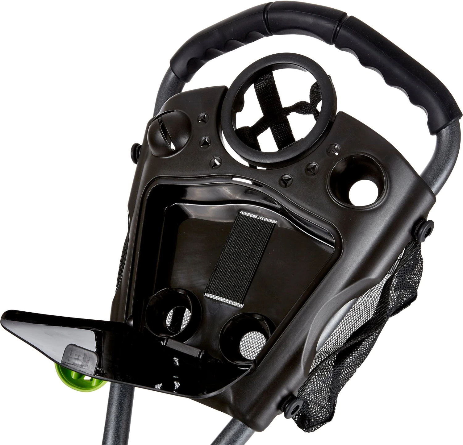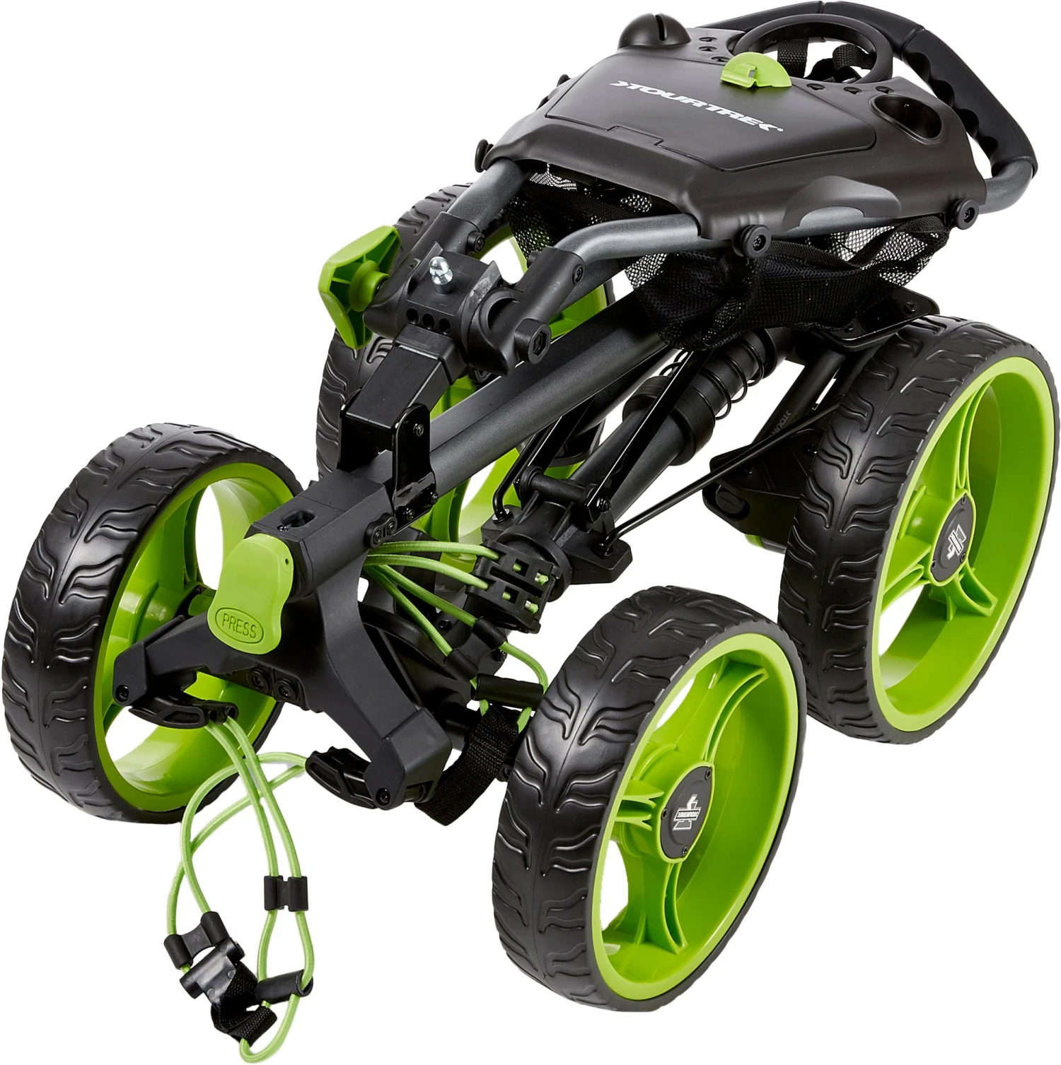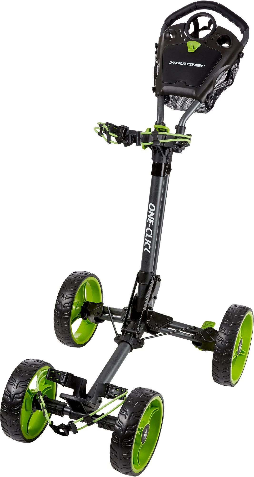 Navigate the course in style with the Tour Trek 2018 One-Click 4-Wheel Push Cart. A sturdy metal frame with high strength support cables and 4 oversized wheels allow you to get from tee to green with maximum stability.