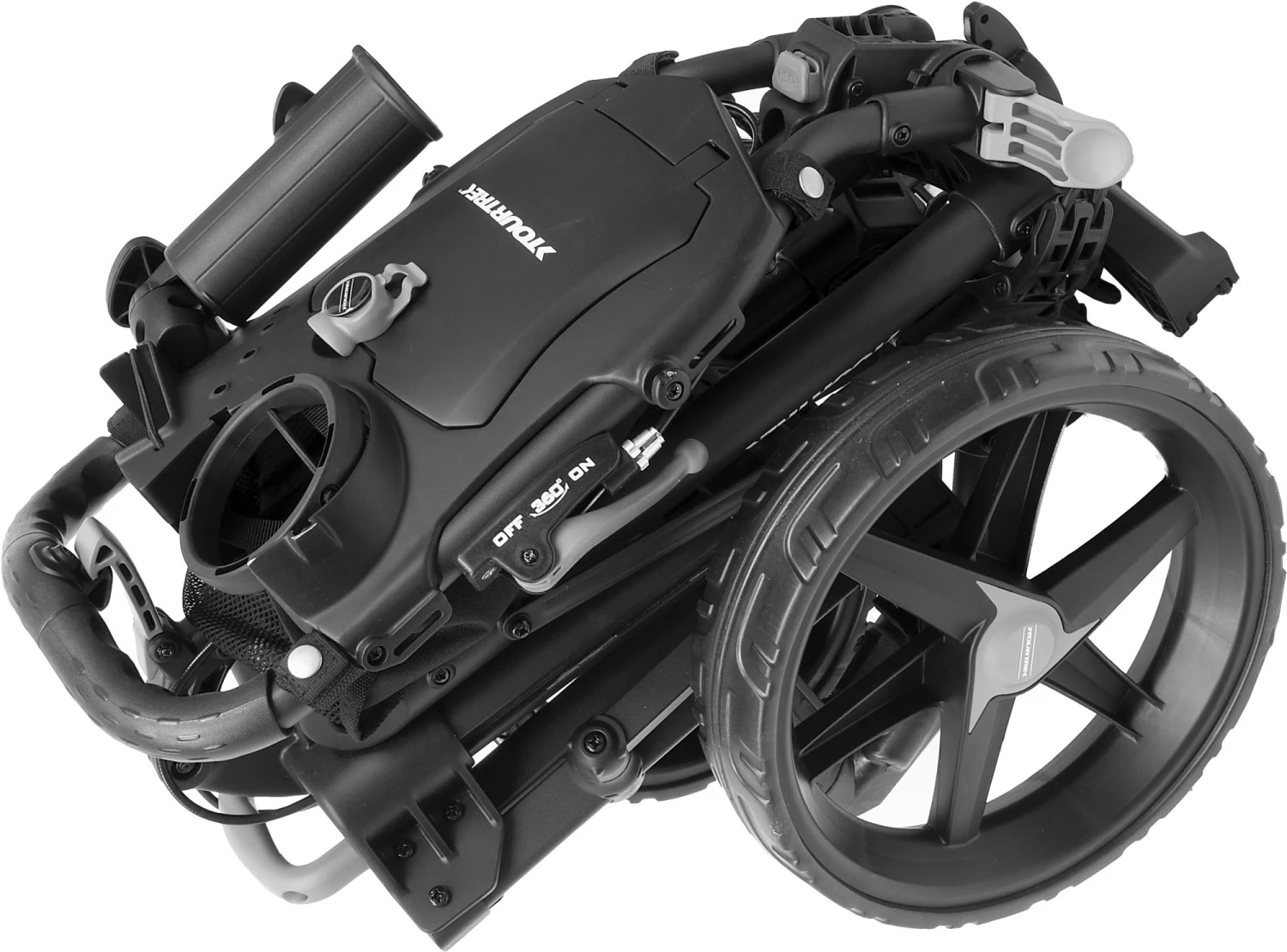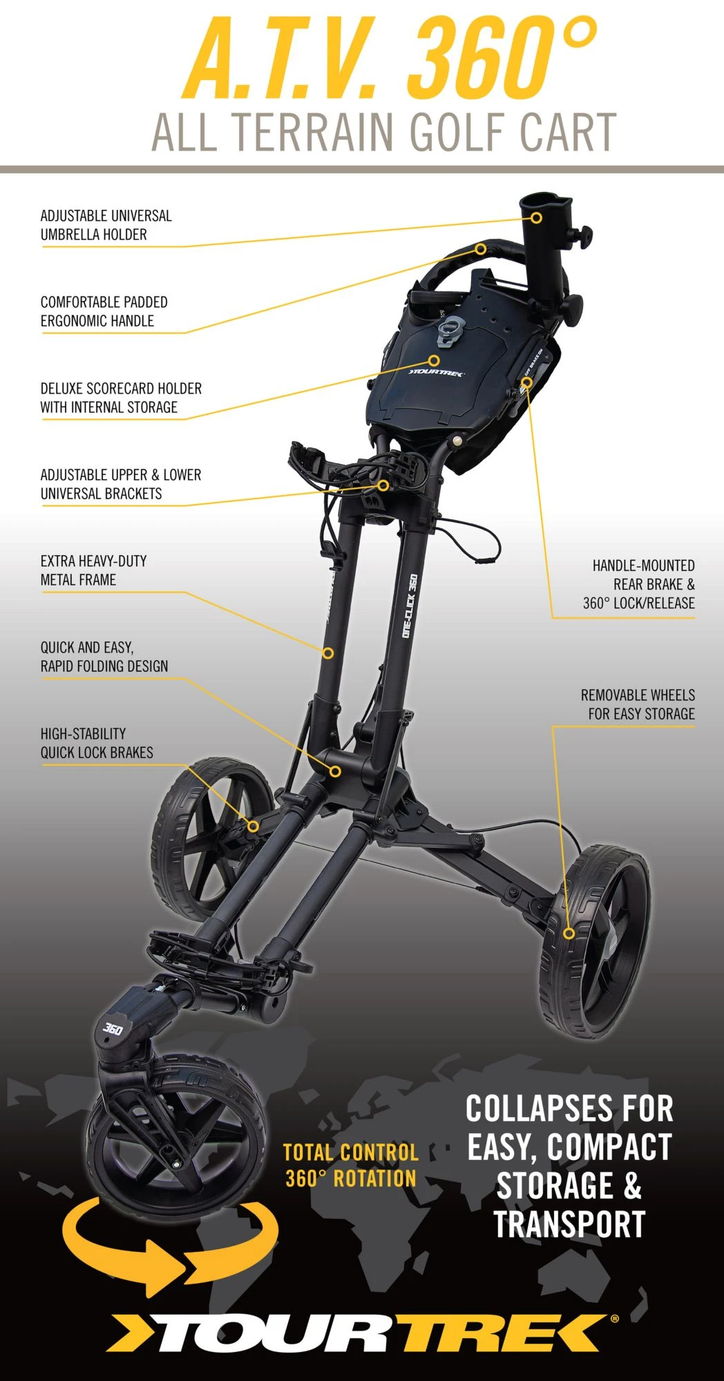 - Handle-mounted rear brake and 360° lock/release